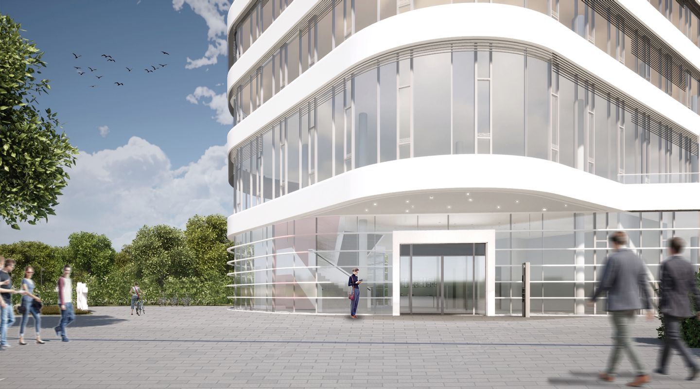 Auf einem transparenten Erdgeschoss in dreieckiger Grundrissform, das den Eingangsbereich mit Freitreppe sowie die zentrale Logistikfläche enthält, setzt sich ein ebenfalls transparenter, 4-geschossiger Riegel mit gerundeten Fassadenecken ab.